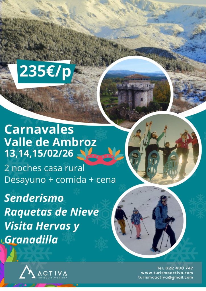 Carnavales en el Valle de Ambroz con senderismo, raquetas de nieve, visitas culturales y alojamiento rural con pensión completa.